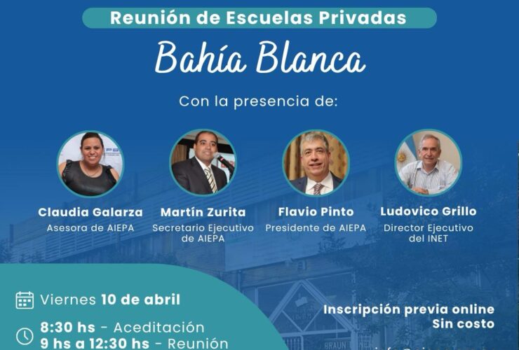 Referentes de escuelas privadas de Bahía Blanca y la región participarán este viernes 10 de abril de una reunión zonal clave para analizar la actualidad y los desafíos del sistema educativo. El encuentro es organizado por la Asociación de Institutos ...